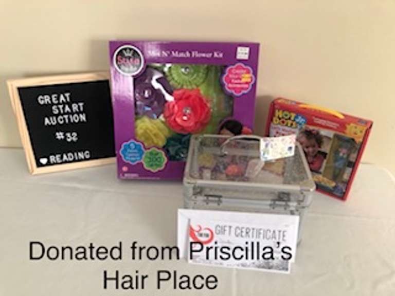 1 haircut at Priscilla's Hair Place, a clear Caboodle, a flower kit, and Hot Dots Jr. activity