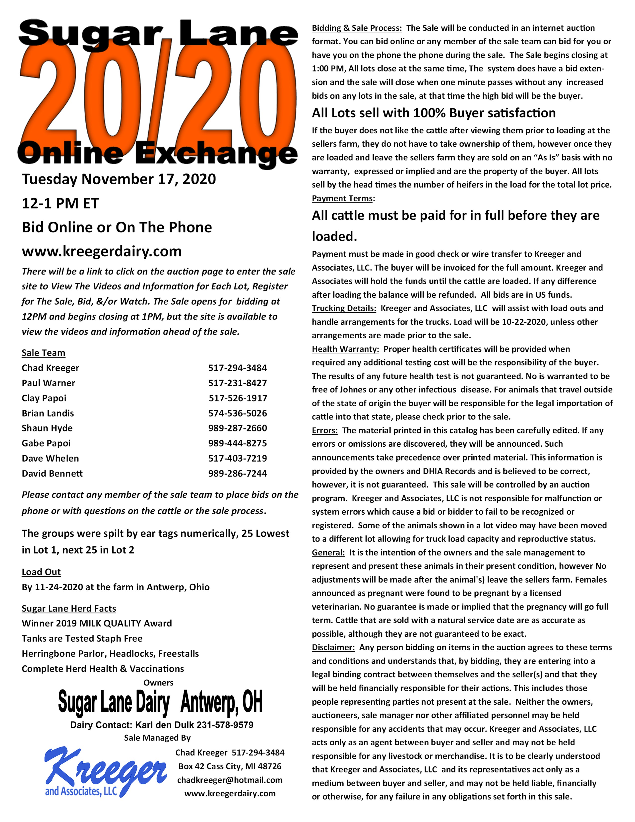 If there is an update sheet posted on www.kreegerdairy.com auction page prior to the sale. Any updates on that will take precedence over other information listed in the sale catalog and on the auction site.