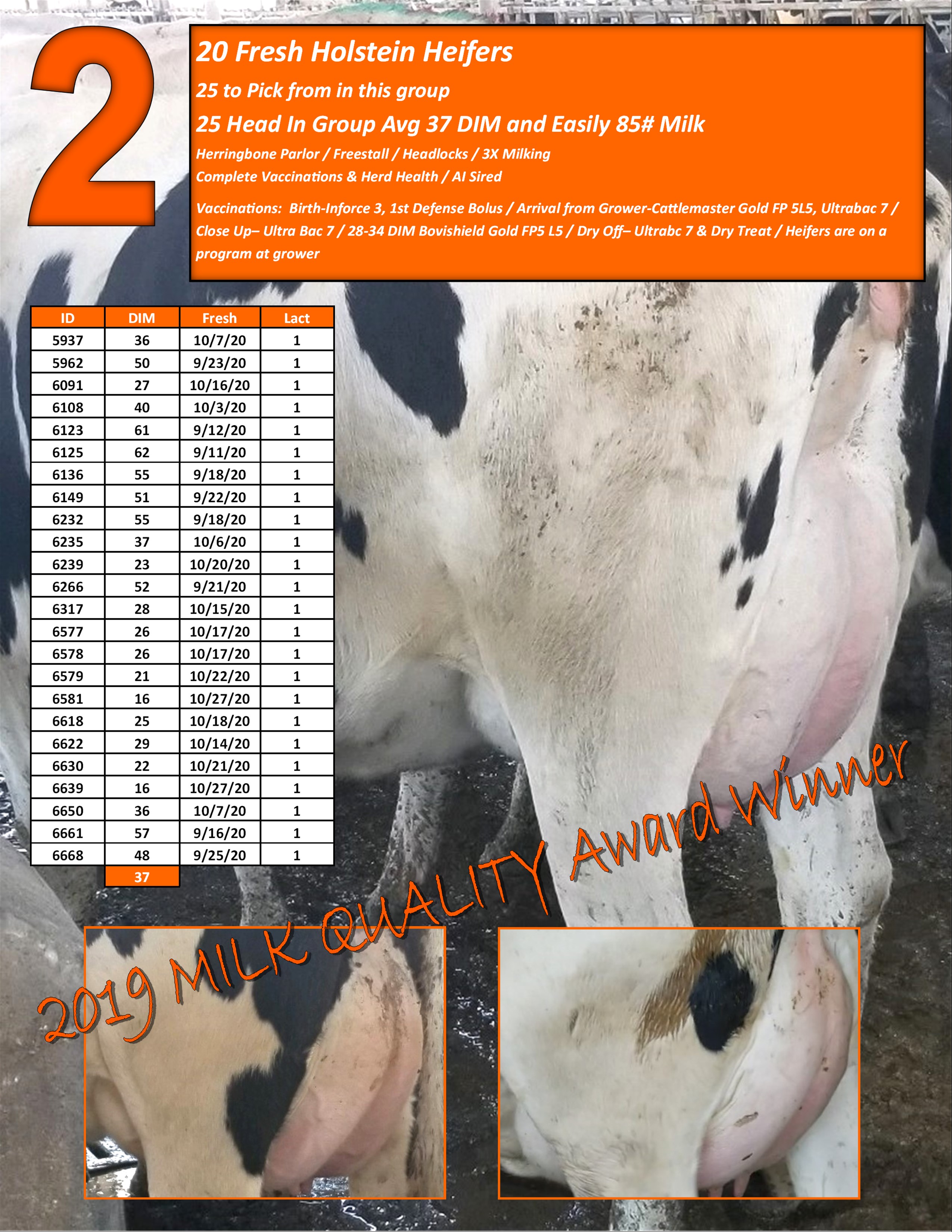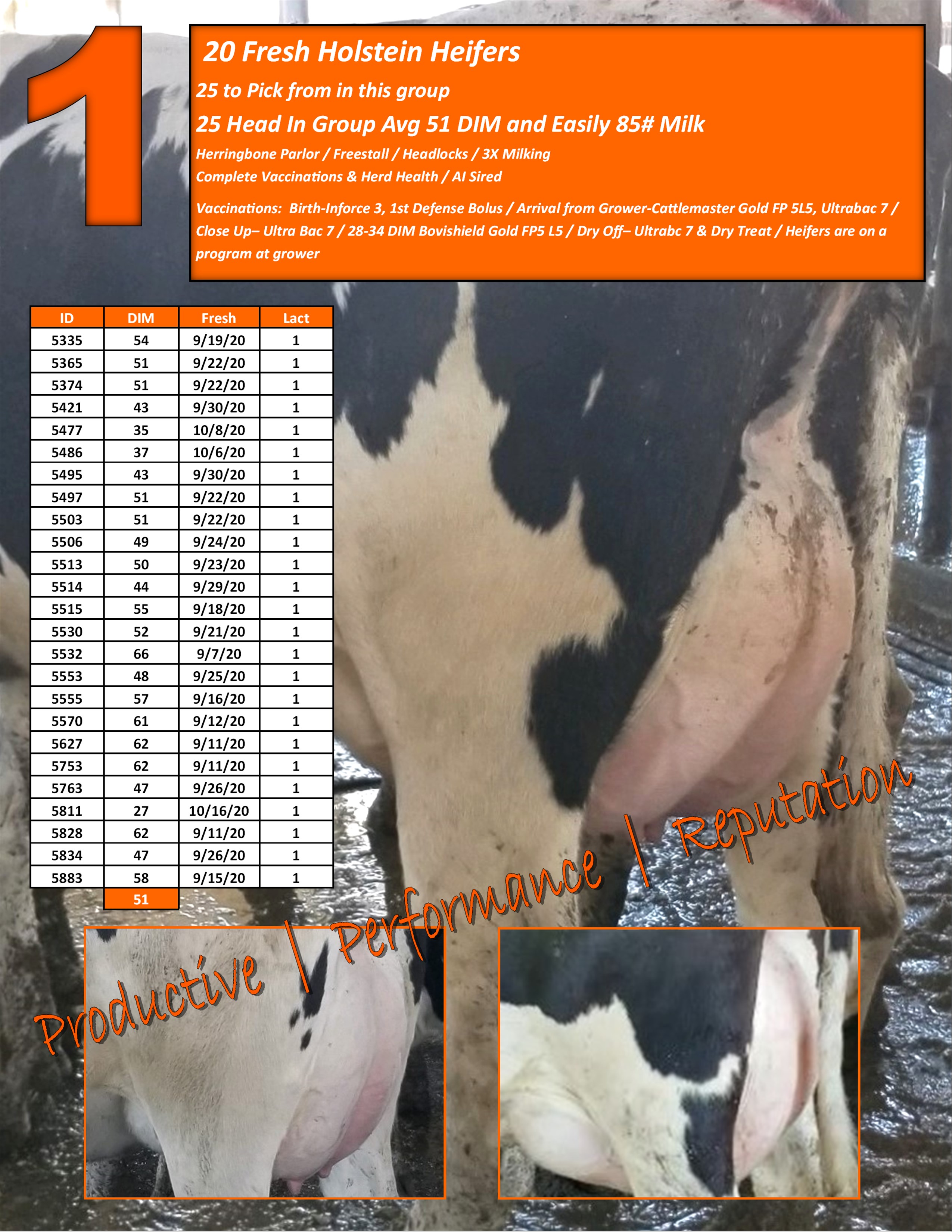 20 Fresh Holstein Heifers Avg 51 DIM (25 In Group to pick from)