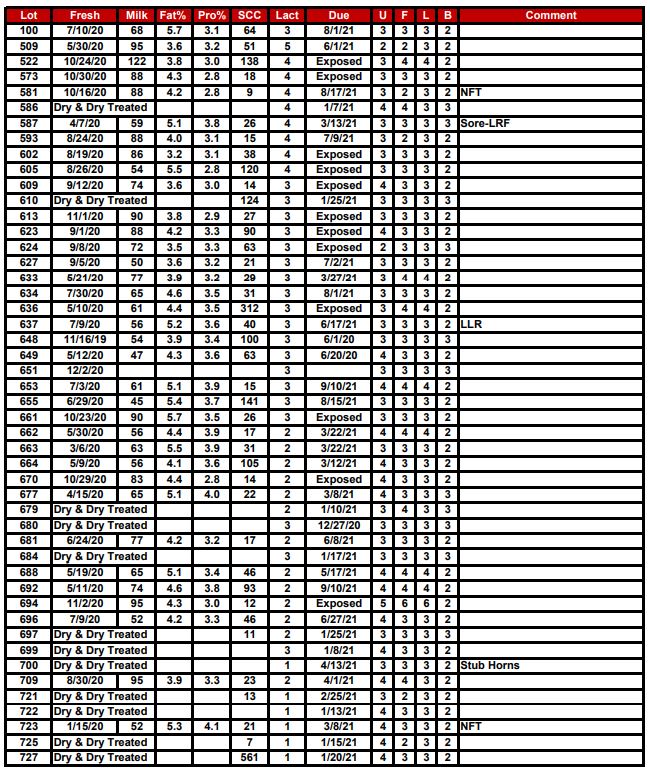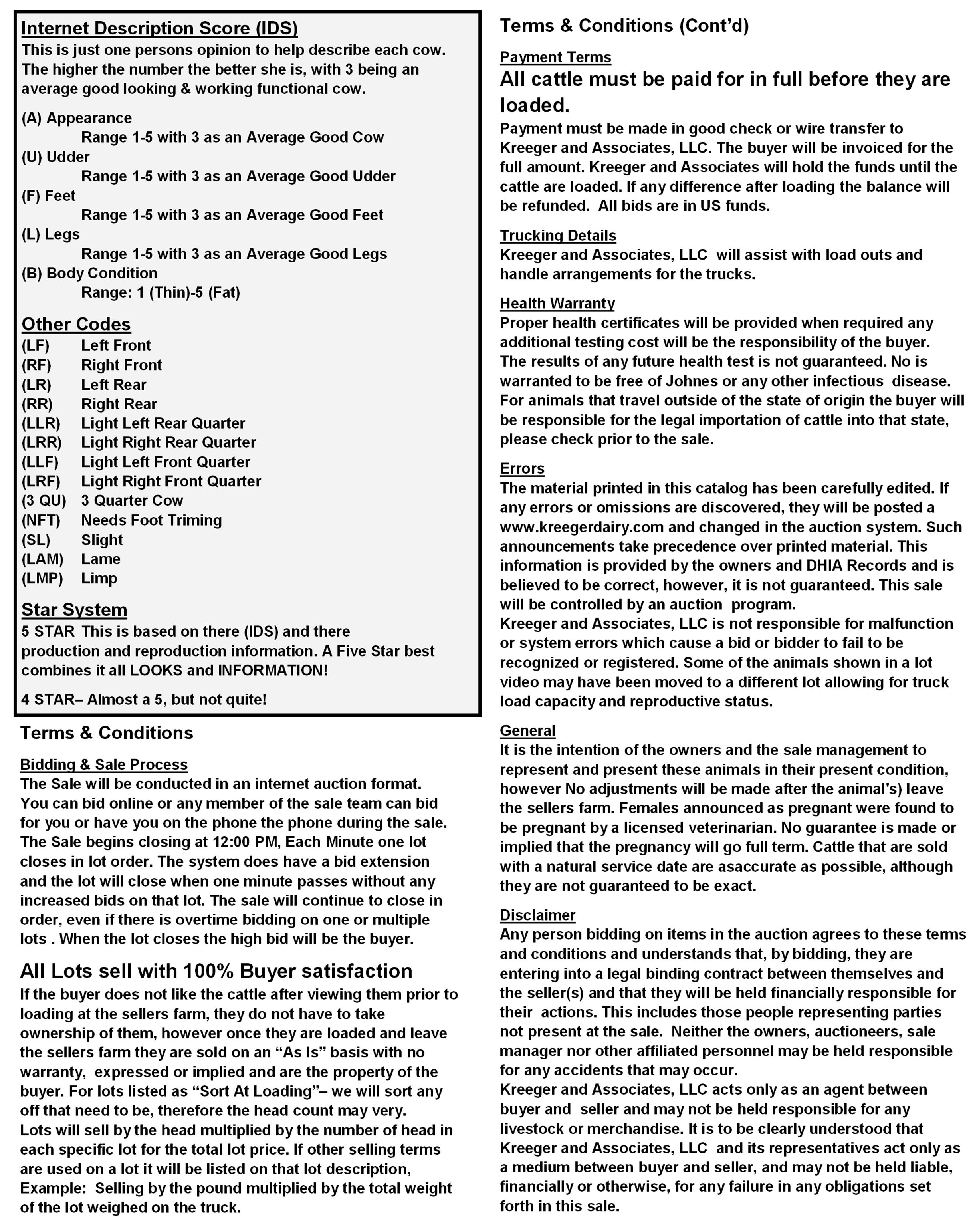 There will be an update sheet posted on www.kreegerdairy.com auction page prior to the sale. Any updates on that will take precedence over other information listed in the sale catalog and on the auction site, However the updates will be added to the auction site.