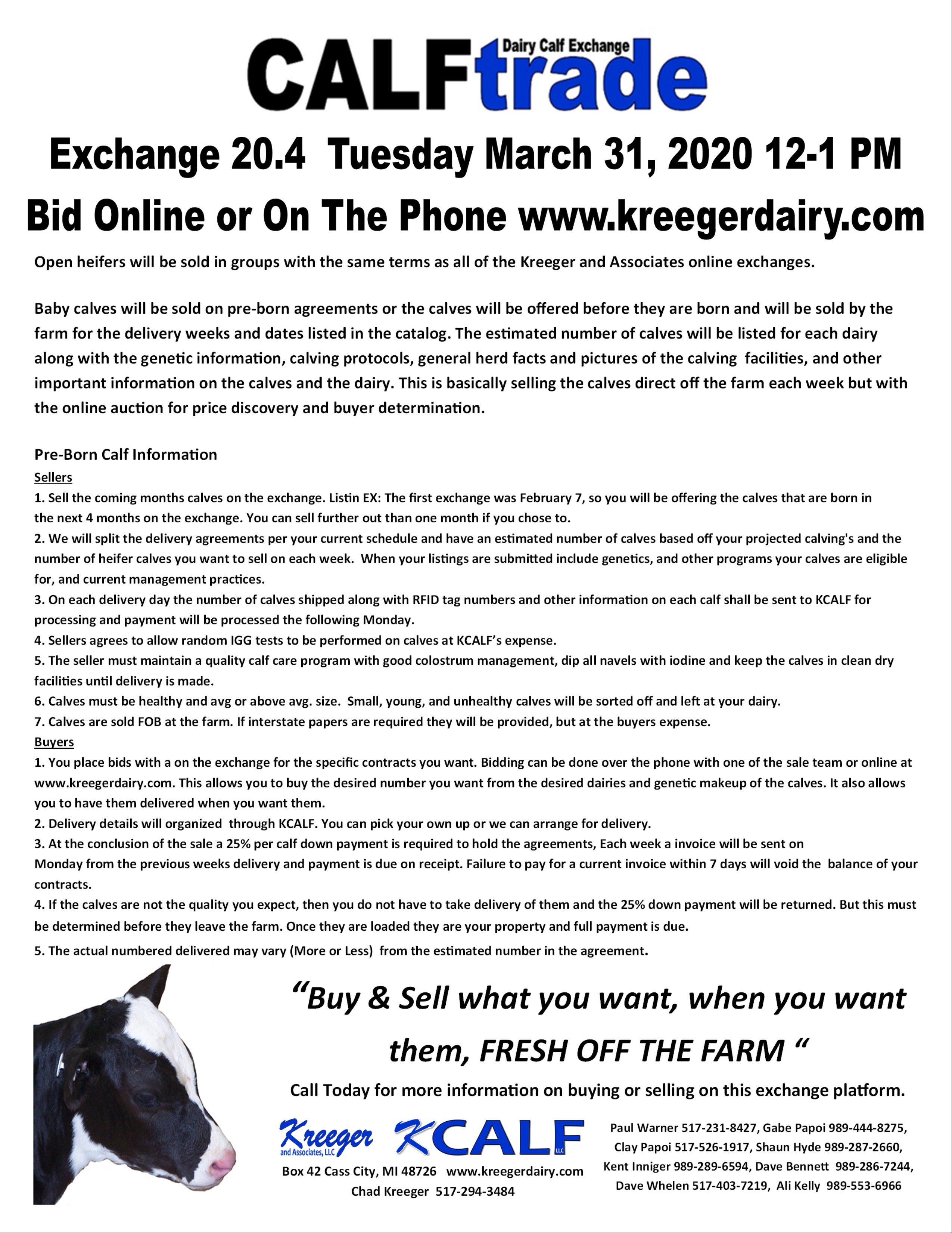 Bull Calf Group Bids are per pound. The Calves will be weighed individually on the calf scale at the dairy.