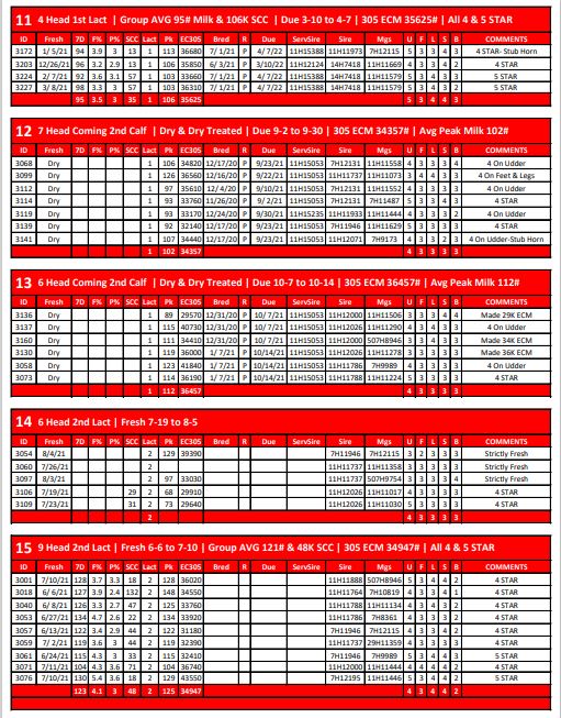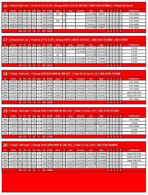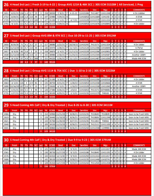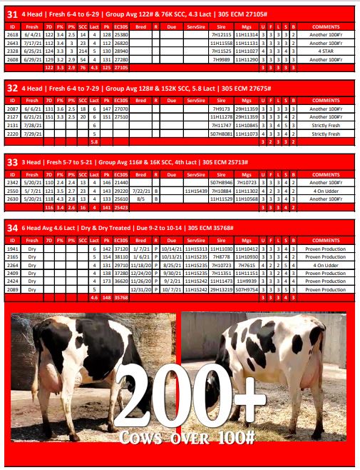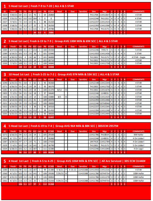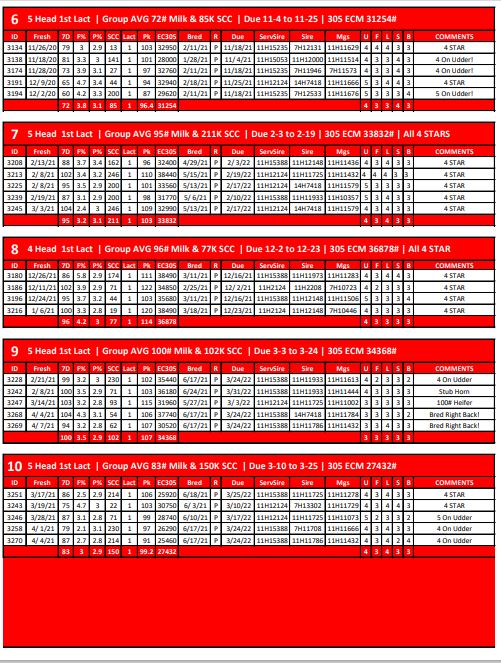 5 Head 1st Lact | Group AVG 72# Milk & 85K SCC | Due 11-4 to 11-25 | 305 ECM 31254# | 3134 3138…