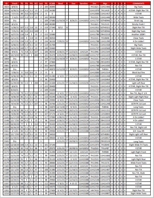 | ID | Fresh | 7D | F% | P% | SCC | Lact | Pk | EC305 | Bred | R | Due | ServSire | Sire | Mgs | U | F | L | S | B | COMMENTS |
